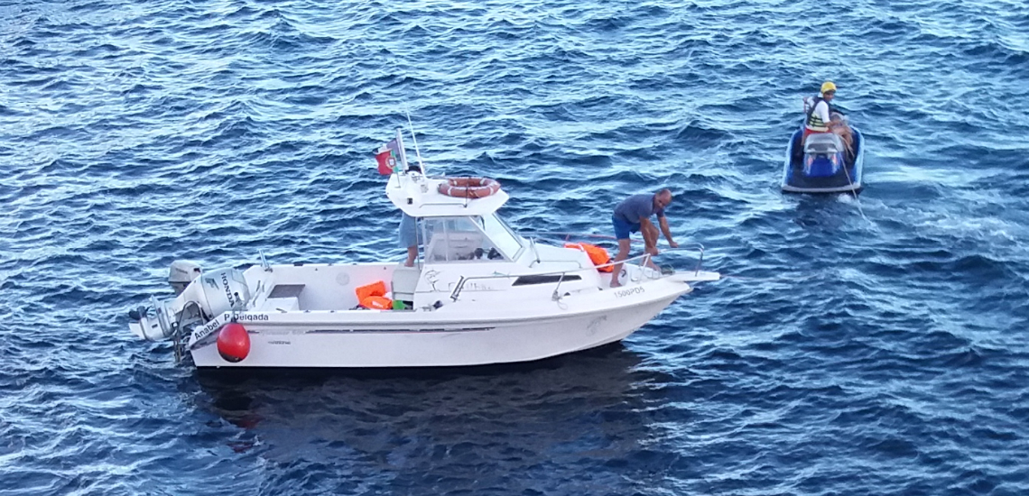 Entretanto dentro de água, a mota de água de salvamento da Capitania conseguiu, devido à sua elevada manobrabilidade em espaços restritos e através da passagem de um cabo de reboque, retirar a embarcação sinistrada das rochas e conduzi-la para uma zona segura. Posteriormente foi rebocada por uma outra embarcação de recreio, com as duas restantes pessoas a bordo, para dentro da marina de Ponta Delgada, sempre acompanhada pelo salva-vidas e pela mota de água de salvamento, até se encontrar atracada em segurança.